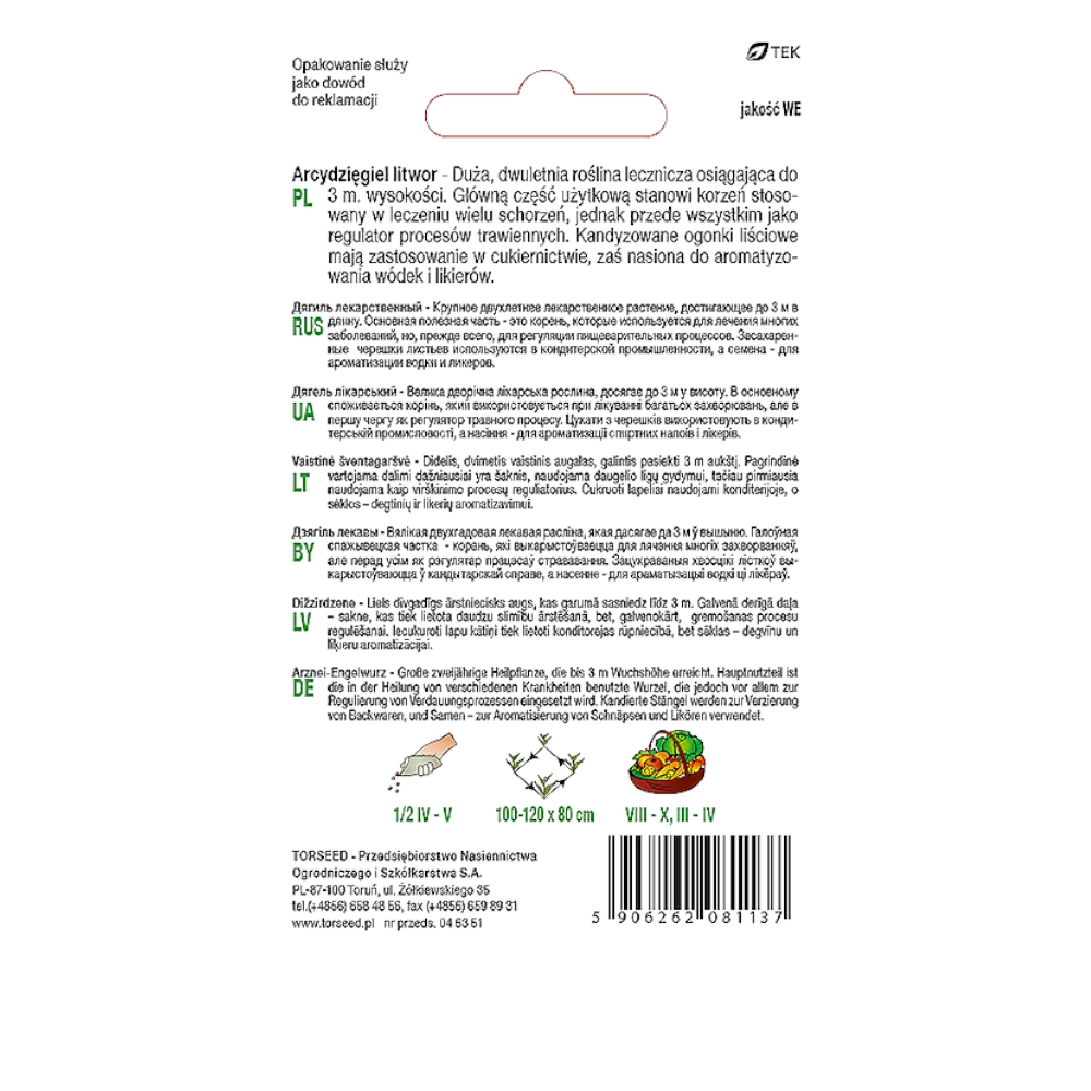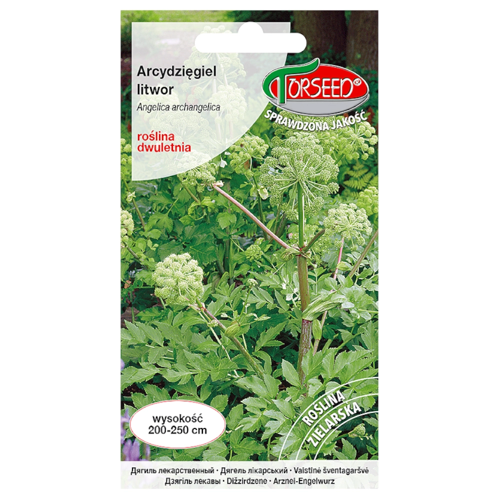 Roślina dwuletnia o dużych rozmiarach. Roślina ma bardzo grubą łodygę, dorasta do 2m wysokości, pierzaste liście i kwiaty zebrane w charakterystyczne baldachy. Zapach kwiatów jest mocny ale przyjemny. Część użytkową stanowią kandyzowane ogonki liściowe w cukiernictwie, nasiona do aromatyzowania napojów oraz korzenie i kłącza w lecznictwie przy zaburzeniach trawienia i nieżycie jelit. Wszystkie części rośliny pachną mocno korzennie i mają gorzkokorzenny smak.