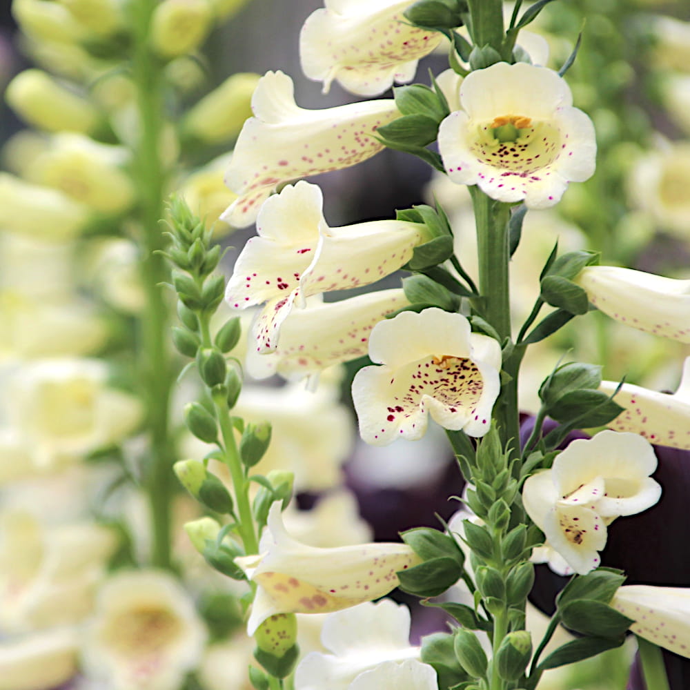 Roślina dwuletnia o wys. 120 cm, prostych, wzniesionych łodygach. Kwiaty dzwonkowate, barwy białej z wiśniowo-czerwonymi plamkami w gardzieli, zebrane w gęste kłosy rozwijające się od dołu ku górze.