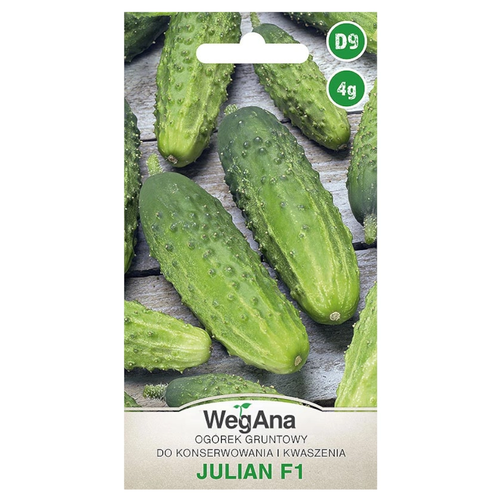 Ogórek konserwowy Julian F1 to odmiana średnio późna, grubo brodawkowa, smaczna. Chętnie wybierana ze względu na dużą plenność. Tworzy owoce kształtne, zielone ze smugami do połowy długości owocu, z brodawkami średniej wielkości z białymi kolcami.
