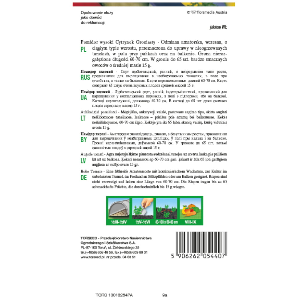 Pomidor wysoki Cytrynek Groniasty – typ cherry. Odmiana amatorska, wczesna o ciągłym typie wzrostu, przeznaczona do uprawy w nieogrzewanych tunelach, w polu przy palikach oraz na balkonie.