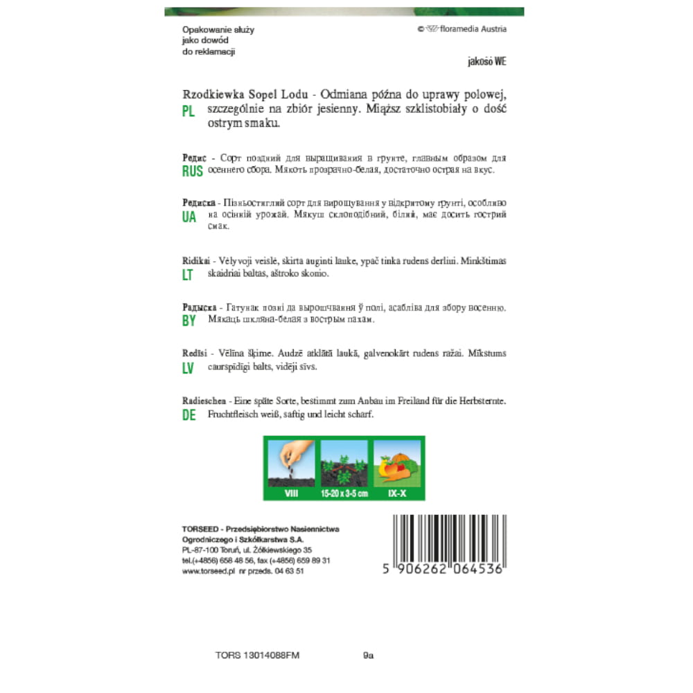 Rzodkiewka Sopel Lodu to odmiana późna do uprawy polowej, szczególnie na zbiór jesienny. Tworzy duże, długie, wrzecionowate zgrubienia barwy białej. Miąższ szklistobiały, o dość ostrym smaku. Wykazuje małą skłonność do parcenia.