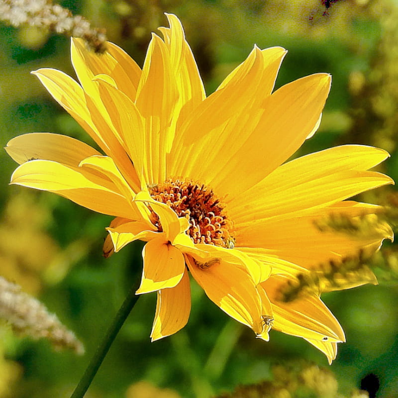 Bylina do 120 cm wysokości. Kwiaty złotożółte zebrane w półpełne koszyczkowate kwiatostany. Kwitnie obficie i długo od lipca do października. Łatwa w uprawie i mało wymagająca, wytrzymała na suszę.